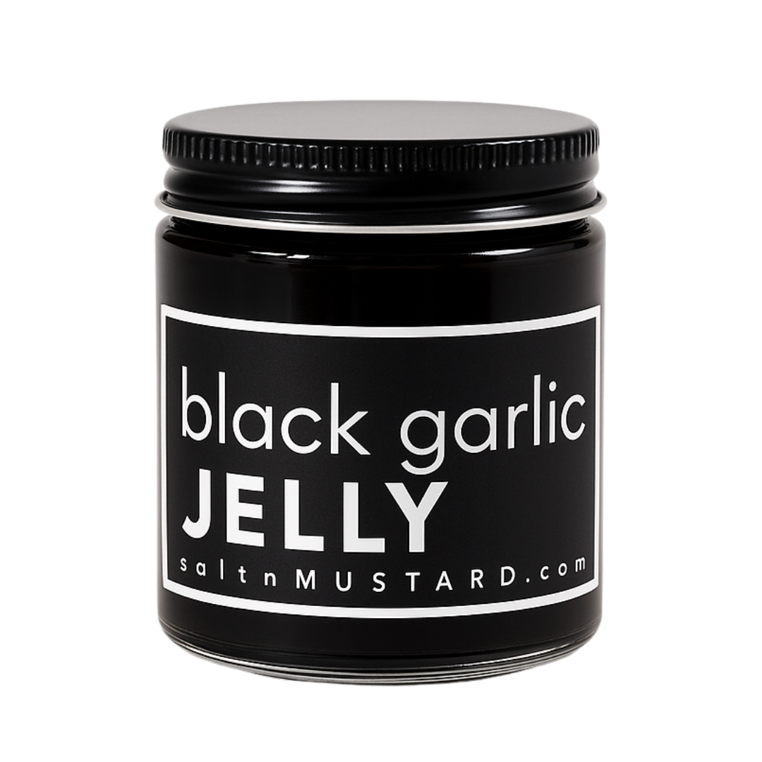 Black garlic jelly is a rich, savoury-sweet spread. The jelly has a smooth, glossy texture and a unique taste that combines the umami richness of the black garlic with subtle sweetness. It carries notes of molasses, balsamic vinegar and a slight tang, making it an ideal complement to cheese boards, roasted meats, or as a topping for toast or crackers, not to mention with a grilled cheese sandwich. This jelly is versitile, adding a gourmet touch to both savoury and sweet dishes.